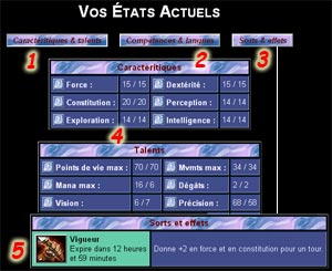 Cet onglet résume l'état actuel de votre personnage. C'est à dire ses caractéristiques et talents,