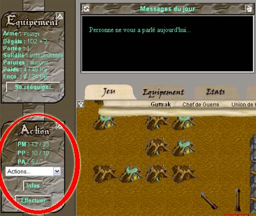 - Les points d'actions (PA) : pour toutes les autres actions possibles