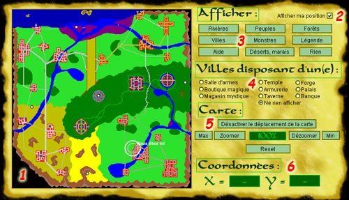 - Les différentes cartes à afficher, si vous voulez connaître le nom des rivières, villes ou forêt.