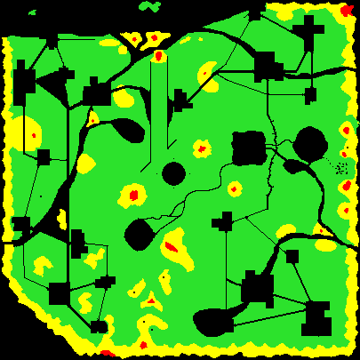 Sur cette carte, on peut voir types de zone. En vert, les créatures les plus faibles (niveaux 1 à 7) et en faible densité.