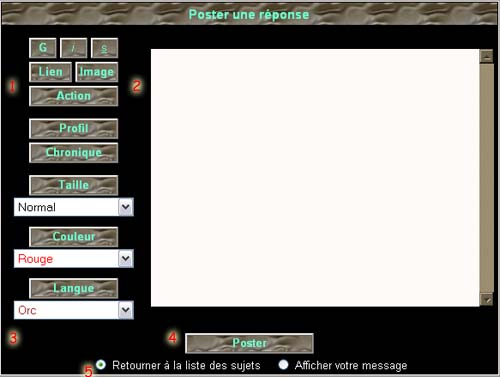| [action]Nhôrk frappa de sa puissante hache le pauvre elfe.[/action] | *** Nhôrk frappa de sa puissante hache le pauvre elfe. *** | Permet d'écrire un texte dans un certain style assimilé à une action. |